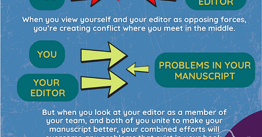 You and your editor share a common goal: you both want to make your book the best it can possibly be. There is no YOU vs. EDITOR here—there’s only YOU AND YOUR EDITOR vs. AREAS OF IMPROVEMENT IN YOUR BOOK.